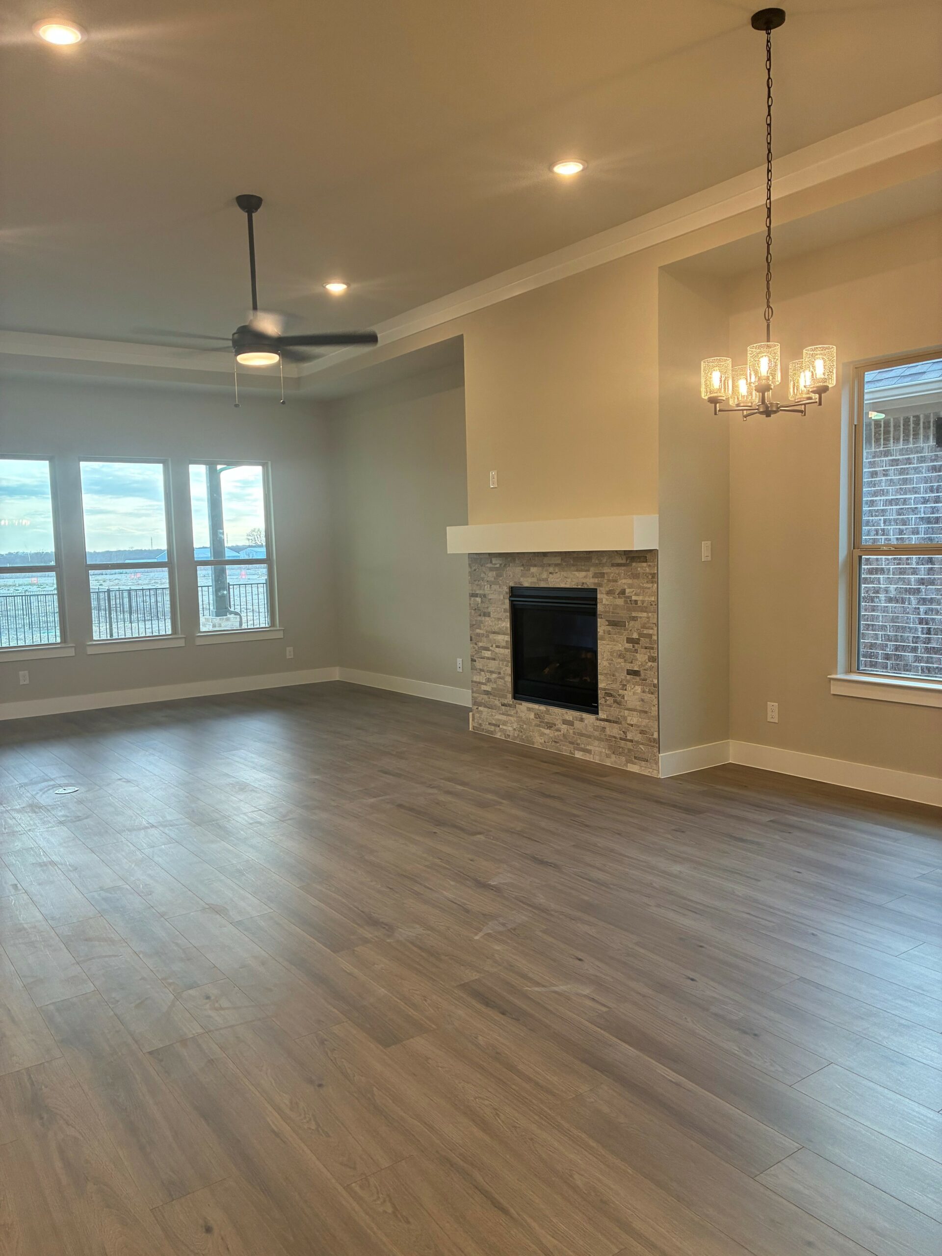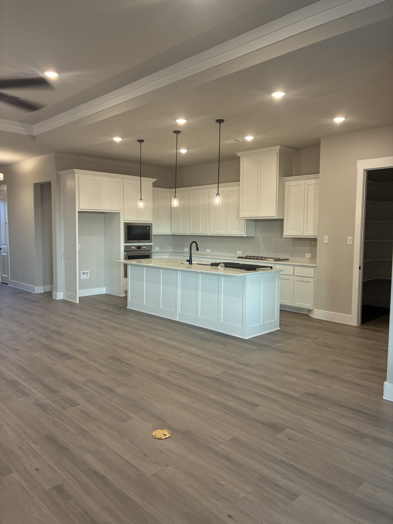 This beautiful single-story Carmina home is designed for both elegant entertaining and comfortable everyday living. The chef-inspired kitchen opens seamlessly to the spacious living and dining areas, all anchored by a cozy gas log fireplace—creating an inviting open-concept layout.