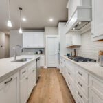 Spacious walk-in closet at Ladera Living with white shelving, hanging rods on three sides, and wood-style flooring