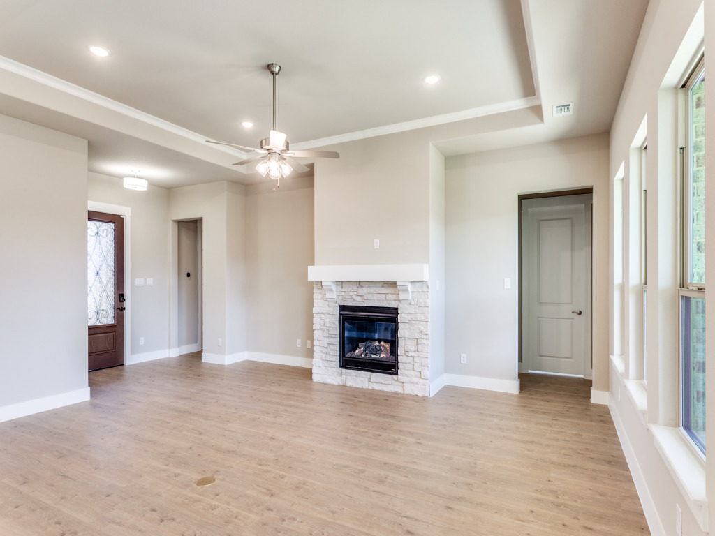 Bright, modern living room with white sofas, a stone fireplace, ceiling fan, and large windows in a Ladera Living home