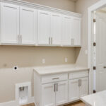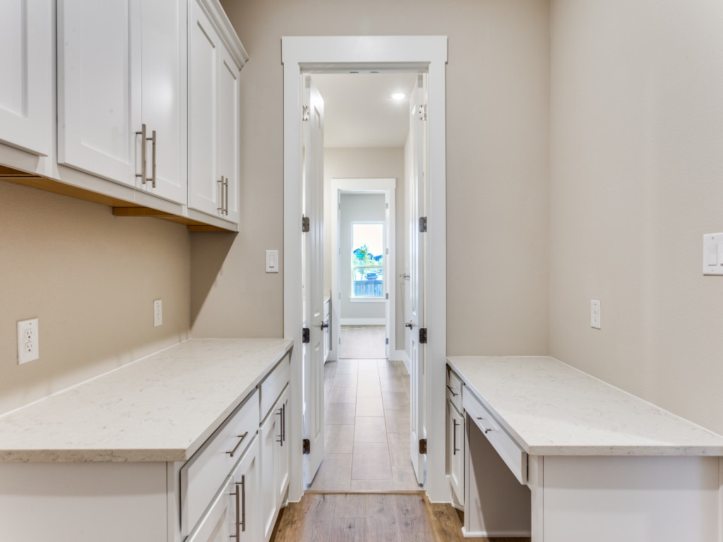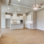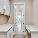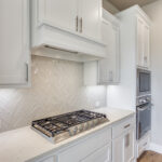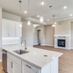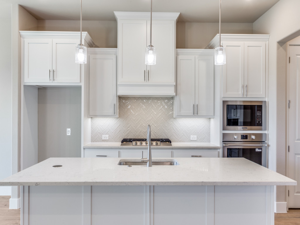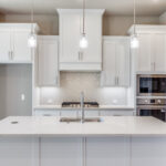 Modern white kitchen with island seating, pendant lighting, and quartz countertops in a Ladera Living home