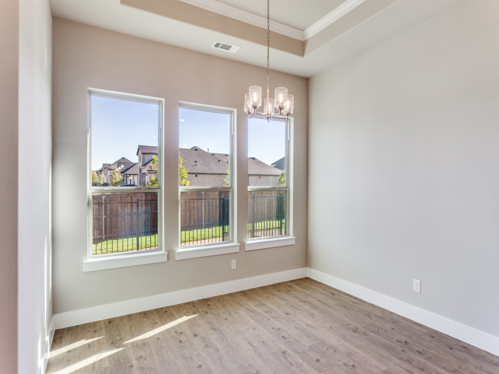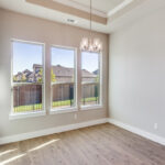 Sunlit dining room with round table, blue chairs, pendant lighting, and large windows in a Ladera Living home