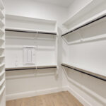 Spacious bedroom with a modern bed, ceiling fan, large windows, and neutral decor in a Ladera Living home
